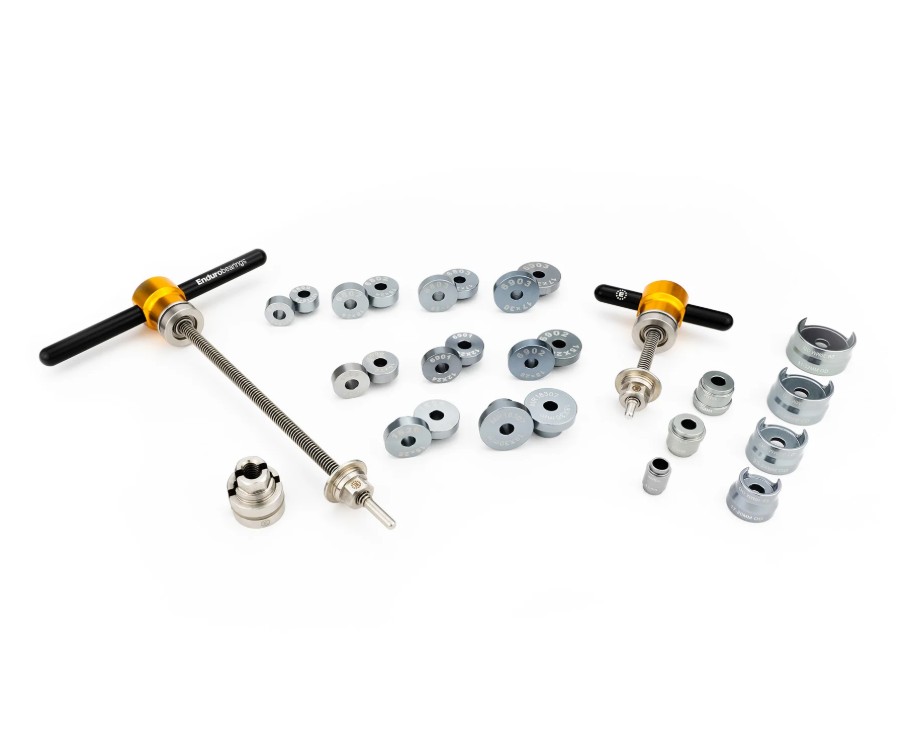 このキットには、ハブまたはサスペンション用途に特化した長さのプレスロッド2本、交換可能なライナークイックハンドル2個、そして最も一般的なハブおよびサスペンションベアリングに対応するベアリングガイドとレシーバーカップ一式が含まれており、効率的かつ正確なベアリングの取り外しと取り付けを実現します。ガイドサイズは、6800、6801、6802、6803、6901、6902、6903、MR 1526のハブガイド、8/10/11mm、15/17mm、18/20mmの両面サスペンションインナー(プッシャー)パイロット、そして12mmから32mmまでのベアリング外径に対応する4つの両面レシーバーカップです。