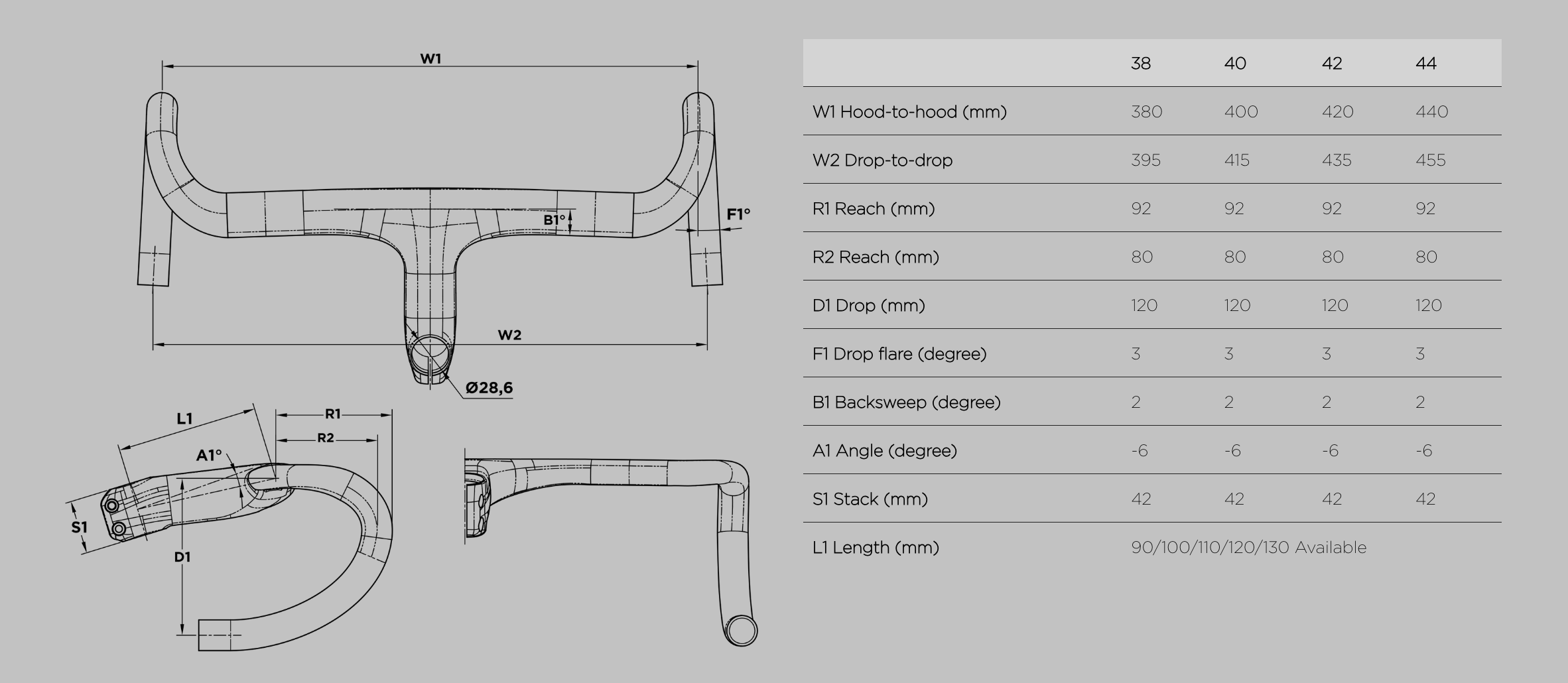 ハンドル幅(C-C):380 / 400 / 420 / 440mm
